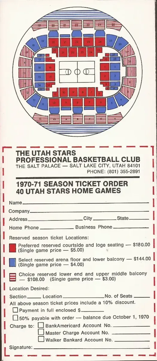 Get hyped, Utah basketball fans! The ABA’s Los Angeles Stars have moved to Salt Lake City and are accepting season ticket orders for the 1970-71 season. Click on any image to enlarge.