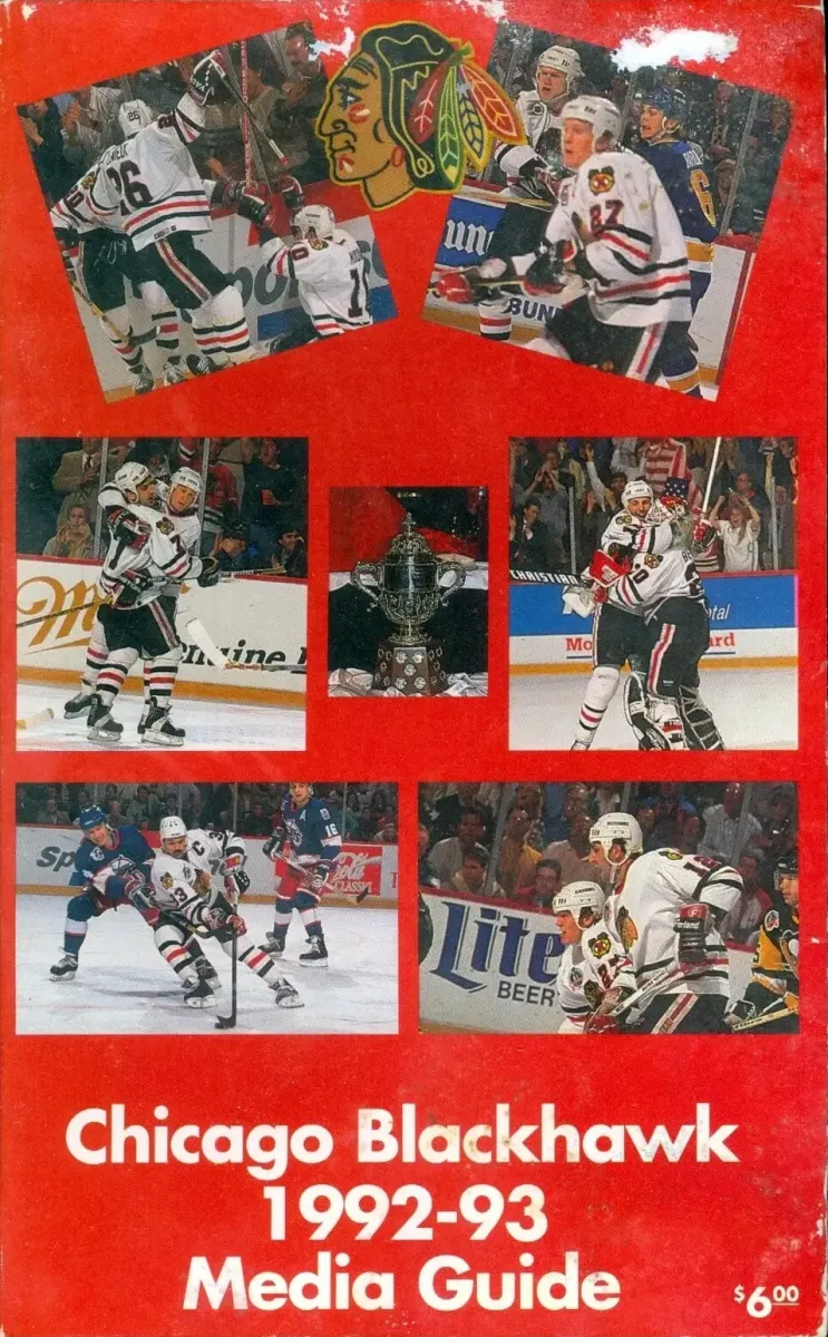 - 1992-93 media guide: Murray Baron (Blues #6), Ed Belfour (#30), Chris Chelios (#7), Dirk Graham (#33), Mike Hudson (#20), Jocelyn Lemieux (#26), Brian Noonan (#10), Eddie Olczyk (Jets #16), Jeremy Roenick (#27), Brent Sutter (#12)